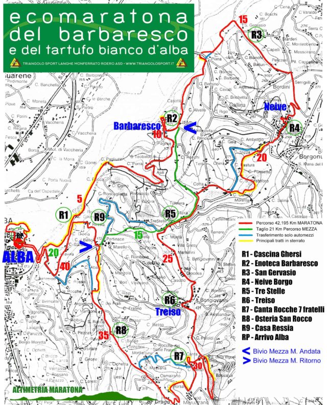 Tutti i percorsi sono panoramici e naturalistici. La Maratona di Km. 42,195 attraversa i quattro comuni di produzione del Barbaresco Docg, Alba, Barbaresco, Neive e Treiso, territorio del Tartufo Bianco d’Alba, percorrendo i sentieri Fenogliani, le Rocche di Barbaresco, le colline e le vigne di Langa, la Strada Romantica e le spettacolari ed aspre Rocche dei Sette Fratelli di Treiso.