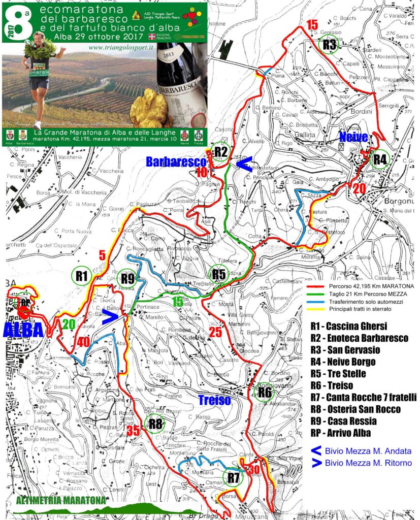 Tutti i percorsi sono panoramici e naturalistici. La Maratona di Km. 42,195 attraversa i quattro comuni di produzione del Barbaresco Docg, Alba, Barbaresco, Neive e Treiso, territorio del Tartufo Bianco d’Alba, percorrendo i sentieri Fenogliani, le Rocche di Barbaresco, le colline e le vigne di Langa, la Strada Romantica e le spettacolari ed aspre Rocche dei Sette Fratelli di Treiso.