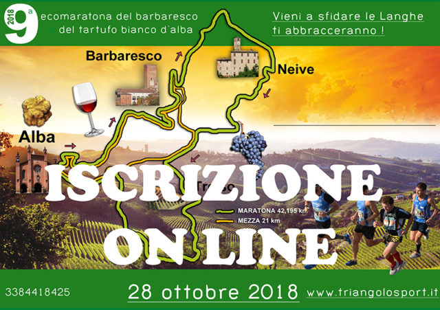 Per immergervi in quella festa di colori l’A.S.D.Triangolo Sport Langhe Monferrato Roero (Fidal CN040 Registro Coni 119121) con il patrocinio della Regione Piemonte, e dei comuni di Alba, Barbaresco, Neive e Treiso, la Provincia di Cuneo ed in collaborazione con l’Enoteca Regionale del Barbaresco, l’Ente Turismo Alba Bra Langhe Roero, l’Ente Fiera Internazionale del Tartufo Bianco d’Alba, il Consorzio Turistico Langhe Monferrato Roero, l’Associazione dei Paesaggi Vitivinicoli Patrimonio dell’Umanità Unesco, organizza la 9a edizione dell’ Ecomaratona del Barbaresco e del Tartufo Bianco d’Alba (Maratona di Alba), manifestazione di corsa podistica.