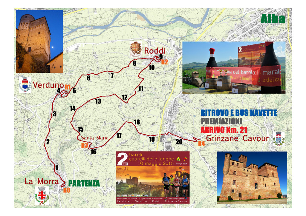 A.S.D. Triangolo Sport Langhe Monferrato Roero (Fidal CN040 Registro Coni 119121) con il patrocinio della Regione Piemonte, dei comuni di La Morra, Verduno, Roddi e Grinzane Cavour, l’Unione dei comuni “Colline di Langa e del Barolo”, la Provincia di Cuneo, l’Associazione dei Territori Vitivinicoli Patrimonio dell’Umanità Unesco, l’Enoteca Regionale del Castello di Grinzane Cavour,  la Barolo & Castelli Foundation, il Wimu Museo del vino, l’Enoteca Regionale del Barolo, l’Ente Turismo Alba Bra Langhe Roero, il Consorzio Turistico Langhe Monferrato Roero, organizza la 2a Barolo e Castelli delle Langhe Km. 21, manifestazione di corsa podistica sulla distanza di km. 21.