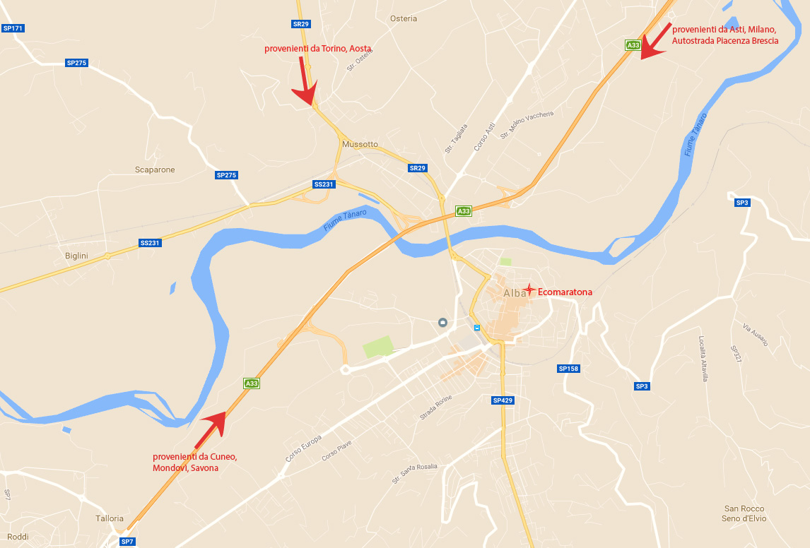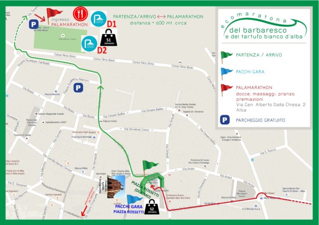Dove si trova il punto di ritrovo Partenza/Arrivo Ecomaratona (Piazza già Rossetti/Retro Duomo) rispetto agli accessi stradali verso la città di Alba: